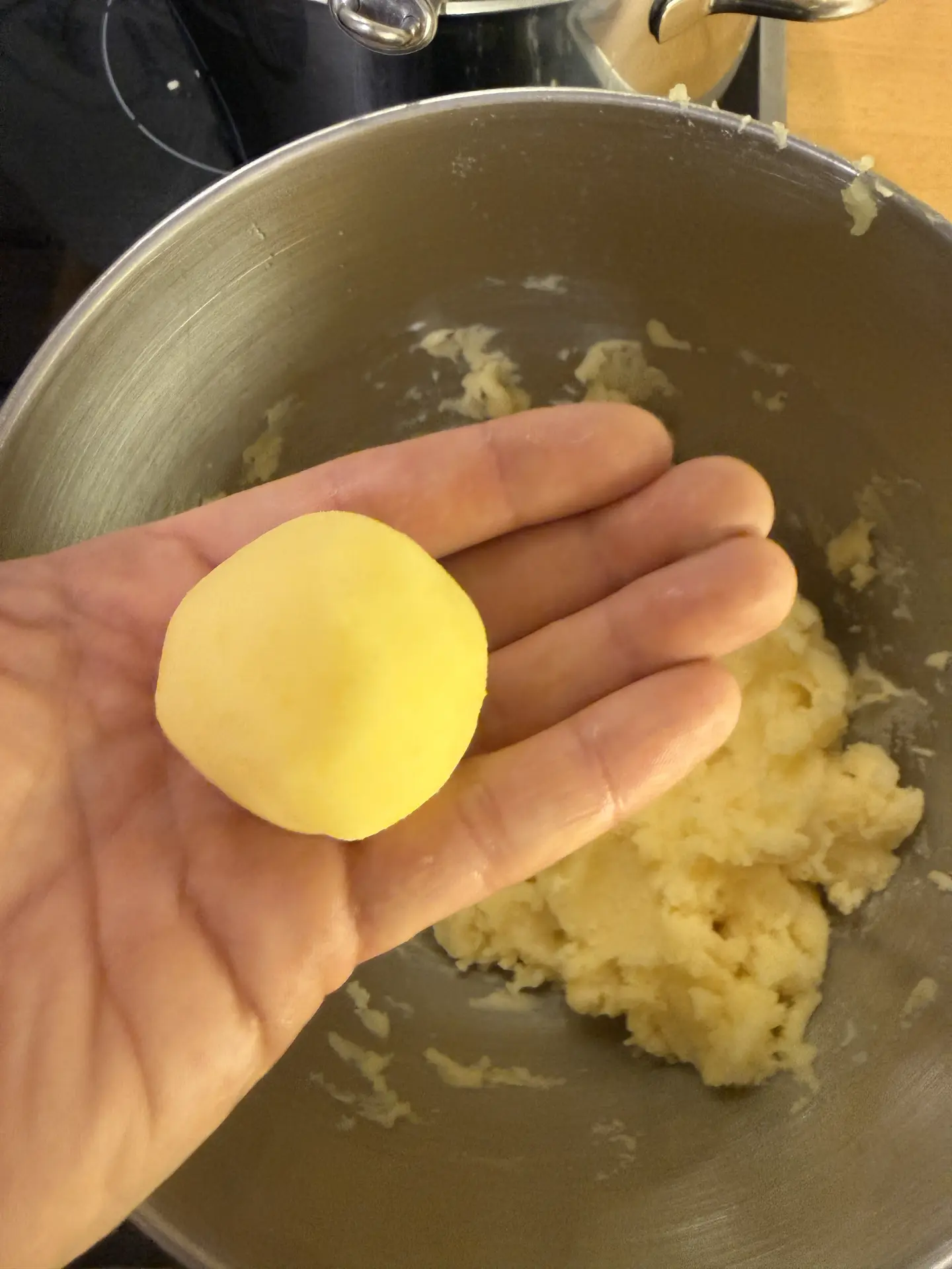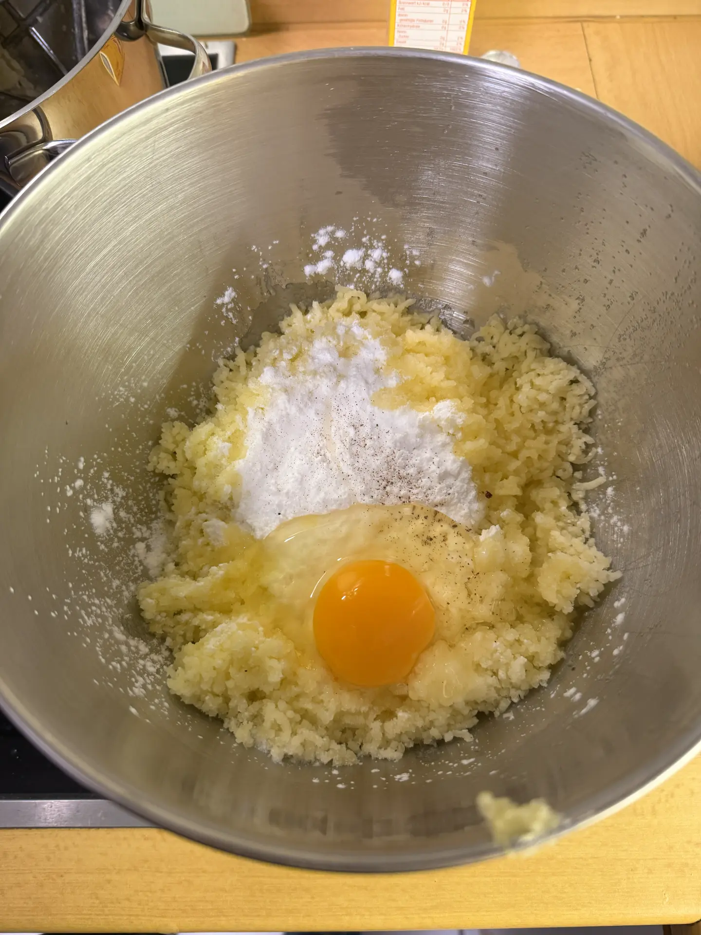 - Kartoffeln pellen und am besten durch eine Kartoffelpresse geben. Wer keine hat, nimmt den Stampfer. Bitte nicht Pürieren, das macht die Kartoffelschleimig und der Teig funktioniert nicht.