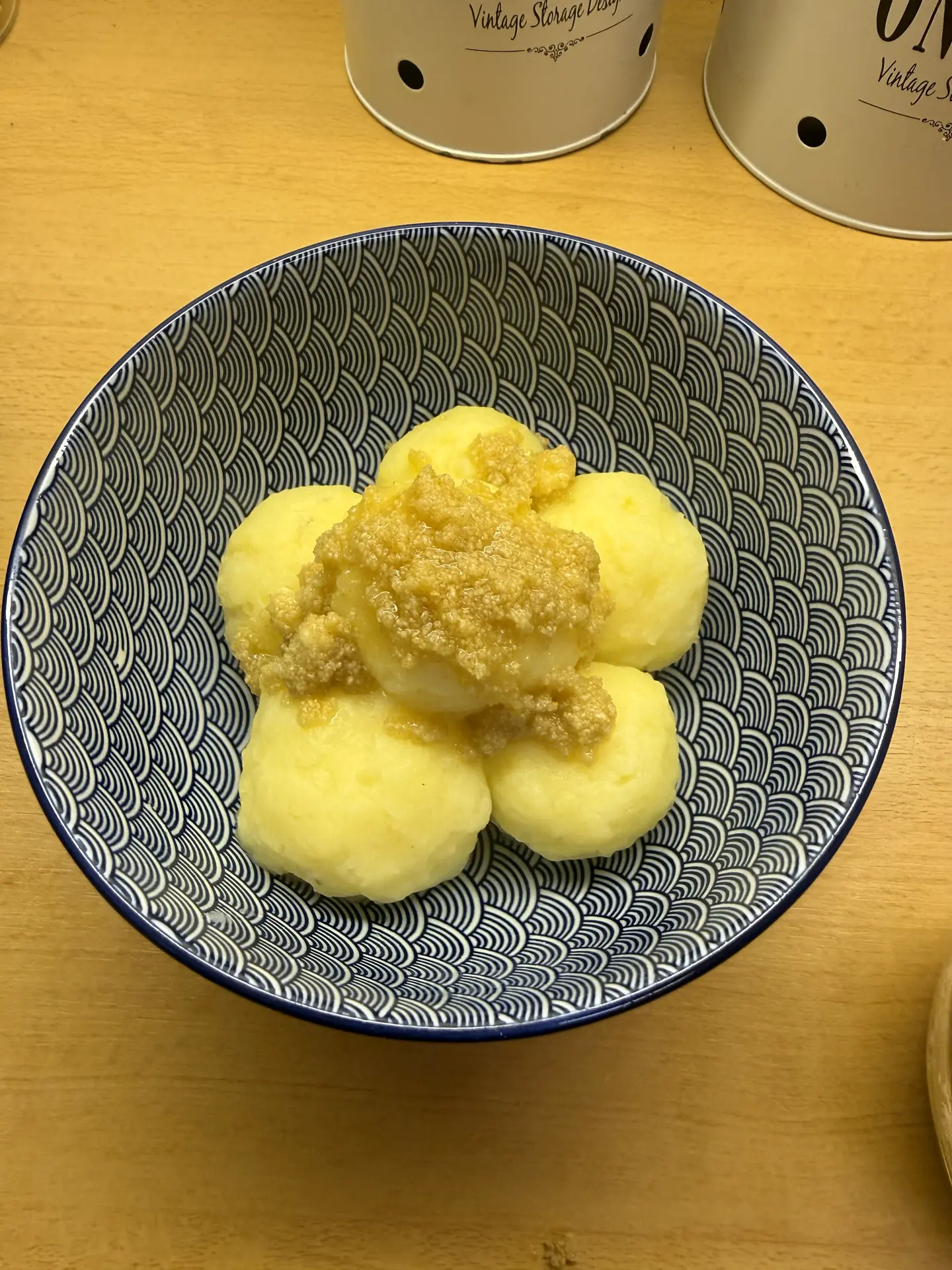 - Die geschmolzene Butter mit Salz und Muskat unter die Kartoffeln geben.